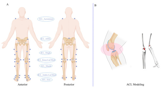 (A) The reflective markers were placed at specific locations to enable the CM; (B) The OpenSim platform was used to present the ACL as a model of nonlinear elastic passive soft tissue.
