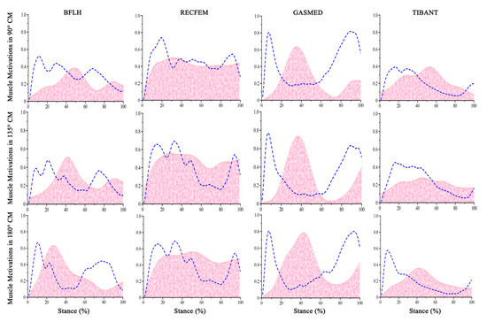 The comparison of the experimentally measured (pink area) and the OpenSim-CMC (blue dashed line) simulated muscle activity for each muscle. The corresponding curves representing the mean values over the stance phase of CM at all three conditions (90°, 135°, 180°). Abbreviations: BFLH—biceps femoris long head, RECFEM—rectus femoris, GASMED—medial gastrocnemius, TIBANT—tibialis anterior.