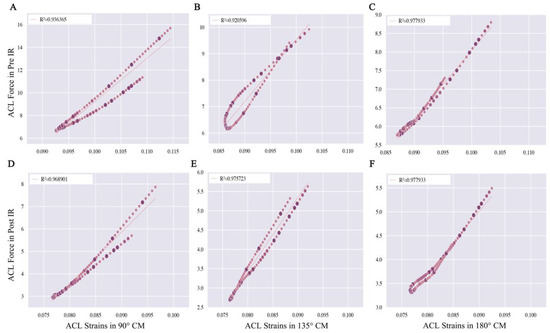 Below are the correlations between ACL strain and force for the three CM directions, pre- and post-IR. (A–C) indicate the correlation between ACL strain and force in the knee joint while performing CM of 90°, 135° and 180°, respectively, before conducting the IR testing; (D–F) indicate the correlation between ACL strain and force in the knee joint while performing CM of 90°, 135° and 180°, respectively, post conducting the IR testing. Abbreviations: The intensity of the dots corresponds to the strength of the relationship between the two variables, with darker dots indicating a closer association.