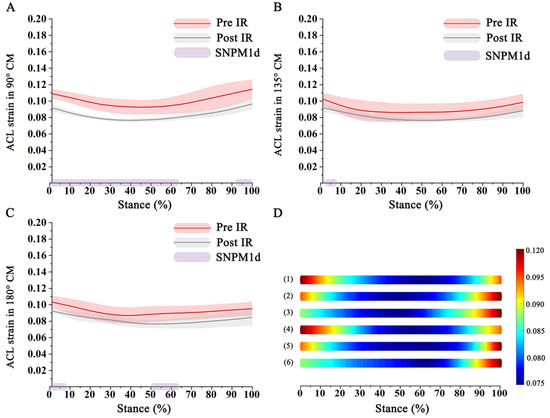 In a case of non-Gaussian distribution of the data we use non-parametric test to compare the time series dataset of (knee angle, moment, and contact force, as well as ACL strain in three horizontal planes during 90°, 135° and 180° CM). We observed that ACL strain was lower after IR training during the 90° CM (Figure 5), and this difference was significant at 0–64%, p = 0.011 and 92–100%, p = 0.010 of the stance. Similarly, during the 135° CM, a lower ACL strain was observed after the IR training, but the difference was only significant at the beginning (0–8%, p = 0.012) of the stance phase. This was the case with 180 CM as well, however significant difference was not only found at the beginning of CM (0–8%, p = 0.010) but also at midstance phase as well (50–64%, p = 0.010).