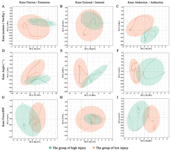 The results of PCA. PCA score plots demonstrate the biomechanical characteristics of 90° CM in pre-IR training. (A–C) demonstrates knee moments score based on the high and low levels of ACL strain during 90° CM; (D–F) demonstrates knee angles score based on the high and low levels of ACL strain during 90° CM; (G–I) demonstrates knee force score based on the high and low levels of ACL strain during 90° CM. The confidence interval of 95% was utilized as the clustering criterion for all PCA score plots.