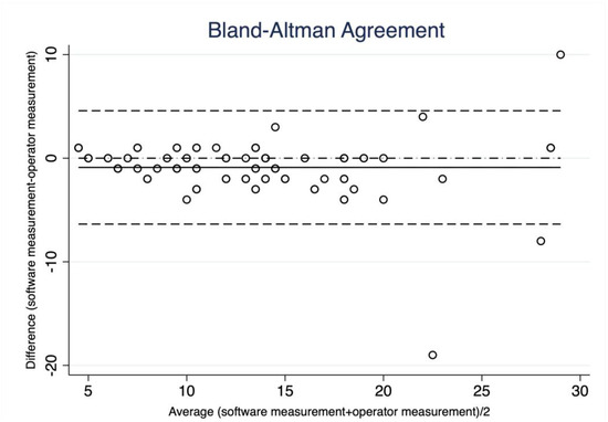 The Bland–Altman method was used for the analysis of continuous data and for the evaluation of software–investigator agreement. Lin’s concordance coefficient and Cohen’s k were also calculated for each breast lesion parameter predicted by the BI-RADS lexicon.