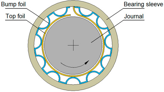 Foil bearings typically function as aerodynamic bearings, but less often as hydrodynamic bearings, using the viscosity of the surrounding fluid to form a lubricating film, eliminating the need for additional complex lubrication systems. The design of foil bearings incorporates the use of both the top and bump foils, in addition to the journal and sleeve [18]. Such a foil bearing structure is shown in Figure 1. By employing compliant foils, the dynamic stability of rotors supported by foil bearings experiences a significant improvement. This is because the shape of the lubrication space adapts to the current operating conditions. At the same time, the poor damping properties of the lubrication film are compensated by the flexible foil structure (i.e., top foil and bump foils) [19,20,21].