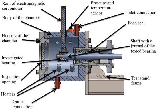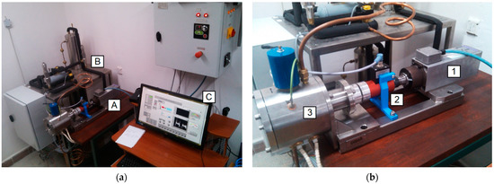 Experimental tests were carried out using a test rig capable of determining the operating characteristics of foil bearings lubricated by any working fluid, including low-boiling liquids. Figure 3 shows the test rig consisting of the following systems: