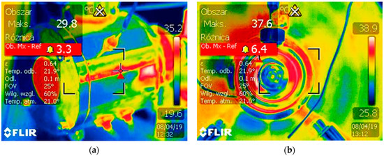 Pictures taken by a thermal imaging camera: (a) View of the outer surface of the chamber; (b) View from the front of the chamber on the bearing (this picture was taken without a glass in the inspection opening).