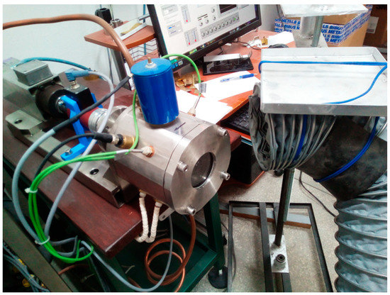 To stabilize the temperature inside the test chamber during the measurement cycles without the use of specialized heat generation systems (e.g., Peltier cells), it was decided to use forced air convection around the measuring chamber. For this purpose, a prepared exhaust hood was used, directing a stream of previously sucked air to the chamber from the same room as the test stand. The outlet of the flexible pipe was directed to the measurement chamber (Figure 6) so that the air stream was blowing the chamber from the side of the low-boiling medium and the ball-bearing block. During the test cycle, the exhaust extractor operated at a constant capacity of 870 m3/h.