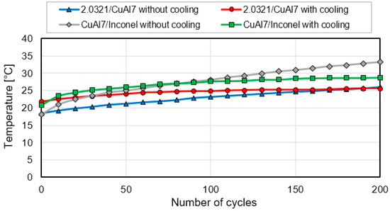 When analysing the temperature rise curves for the material pair 2.0321/CuAl7, in the absence of cooling, the characteristic takes a steadily increasing course (Figure 8). Since two test modes were carried out directly, one after another, the thermal inertia of the system after the first test mode increased the temperature in the chamber. However, the subsequent course of the characteristics already proves the effectiveness of the cooling system. This was manifested by stabilizing the temperature in subsequent cycles. More cycles would reveal the resulting temperature differences.