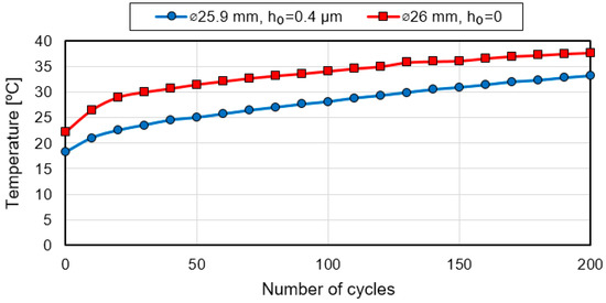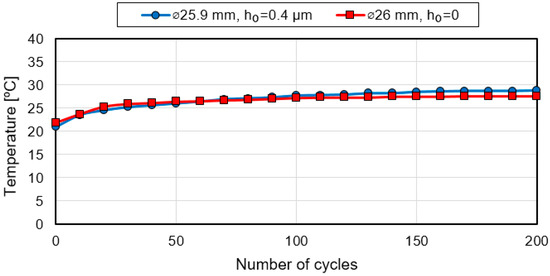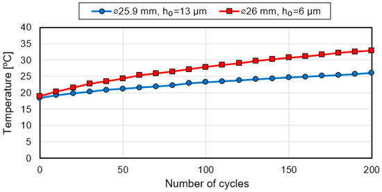 Figure 8, Figure 9, Figure 10, Figure 11 and Figure 12 show the results of temperature measurements using thermocouples placed in the measuring chamber. The temperature rise curves in the test chamber for one bearing housing diameter (25.9 mm), with cooling taken into account, are presented in Figure 8. In the case of the CuAl7/Inconel material pair (top/bump foils), the most significant differences can be seen at the 200th cycle. The use of cooling slows down the temperature rise in the chamber, so it is possible to obtain quasi-stable conditions in the test chamber without boiling the working medium used as a lubricating liquid.