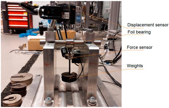 Structural stiffness tests of foil bearings were performed with a maximum static load of approximately 10 N. This load value was chosen due to the small diameter and load capacity of the bearing. It is worth mentioning that during the tests discussed in the earlier section, the foil bearing was statically loaded with only the weight of the sleeve, which is only 96 g. In addition to the loading system with appropriately selected weights, the bearing was continuously loaded with a force sensor weighing 78 g during static stiffness tests (Figure 14). With this sensor, it was possible to record the actual load acting on the bearing. Due to the complementary nature of the research in question, the structural stiffness was only determined in one direction, allowing different material and geometrical configurations of the foil bearing to be compared.