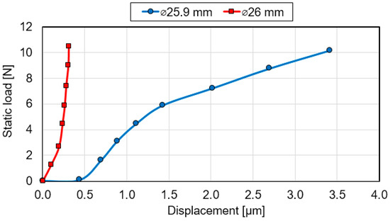 The measurement results of the displacement versus the acting static load are shown in Figure 14 and Figure 15. Figure 14 shows a comparison of the structural stiffness of the bearing with foils made from the material combination 2.0321/CuAl7. From the obtained characteristics, the bearing with a larger sleeve diameter (26 mm) had higher stiffness. The measured bearing clearance was about 6 µm, while the clearance of the bearing with a sleeve diameter of 25.9 mm, which was estimated in the same way, was about 13 µm. The further course of the structural stiffness of the two bearings was similar. Still, the characteristic obtained for the bearing with a smaller sleeve diameter was shifted to the right by a value close to the difference in the initial clearance.