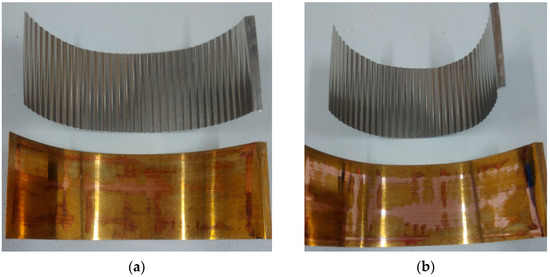 Figure 17 shows a view of the foils used in the tests for the CuAl7/Inconel material pair. The mating surfaces of the top foil and the shaft journal after 200 cycles of sequential start/stop work are visible. Figure 17a shows the surface condition after testing without additional cooling, and Figure 17b after applying external cooling. The consumption is not uniformly distributed. After the predetermined number of test cycles, wear of the shaft journal was not observed.