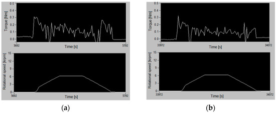 Resistance torque distribution for the CuAl7/Inconel material pair: (a) at the beginning of the test; (b) after 200 start/stop cycles.