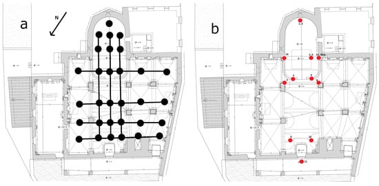Church plan: (a) sites on spatial grid for intensive measurements (black points and lines); (b) positions of instruments for continuous monitoring (red points).