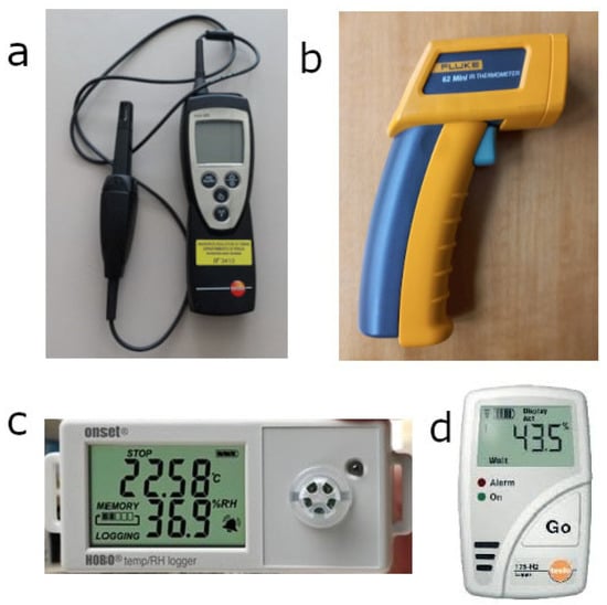 Instruments: (a) Testo 625 thermo-hygrometer, (b) Fluke 62 Mini infrared thermometer, (c) HOBO-UX100-011 thermo-hygrometer, and (d) Testo 175-H2 thermo-hygrometer.