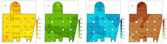 In February, November and April, the horizontal variability for temperature is lower than 0.5 °C; for relative humidity, it is lower than 2.5%; for specific humidity, it is lower than 0.25 g/kg; for dew point spread, it is lower than 0.5 °C. Therefore, the horizontal maps show values depending on seasonality, but the amplitude of scale is the same. In July, the microclimatic horizontal variability is higher (1.1 °C for temperature, 7.8% for relative humidity, 2.2 g/kg for specific humidity and 2.1 °C for dew point distance) as a consequence of some values near the main church door on the left measured in the morning (Figure 4). In this area, a review of instability has reported the presence of moisture infiltrations.