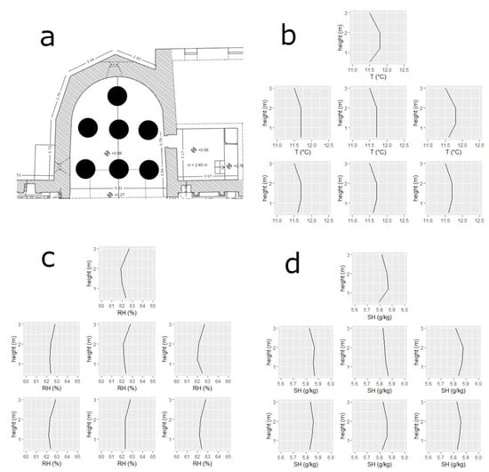 Results show that values of temperature, specific humidity and dew point spread inside the church are homogeneous and depend on seasonality. Relative humidity values belong to the same range (about 60–67%) in every season but not in summer, when the relative humidity values are lower than 55% (Figure 4b and Figure 5b).