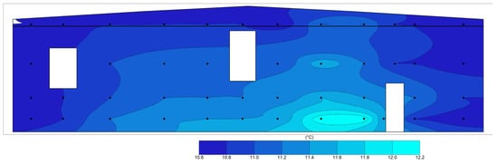 Fresco surface temperature was measured on 22 November 2021 and 22 April 2022 with an infrared thermometer. In both cases, the temperature values show a vertical profile with lower values at the ceiling and higher ones near the floor (Figure 7). Moreover, the walls exposed to the outside (left side in Figure 7) are characterized by lower temperature values in comparison with walls facing south or bordering the rectory (right side in Figure 7).