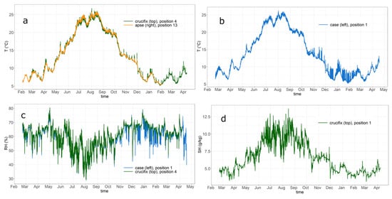 (a) Temperature at crucifix top (green line) and apse near wall right (orange line); (b) temperature on the case (blue line); (c) relative humidity at the crucifix top (green line) and on the case (blue line); (d) specific humidity at crucifix top.
