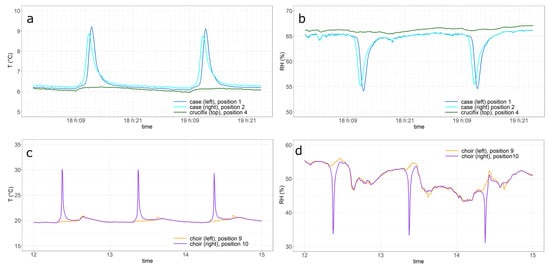 (a) Temperature on the case and at crucifix top on 18 and 19 January 2022; (b) relative humidity on the case and at crucifix top on 18 and 19 January 2022; (c) temperature at the choir from 12 to 14 September 2021; (d) relative humidity at the choir from 12 to 14 September 2021.