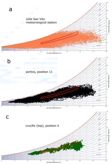 The microclimatic conditions at the different positions are summarized in psychrometric diagrams as shown in Figure 10, where the point cloud represents the air conditions and the red perimeter identifies the values permitted by the UNI standard [3] for frescoes (temperature ranges from 10 °C to 24 °C and relative humidity ranges from 55% to 65%). The comparison between the microclimatic conditions at the crucifix top (Figure 10c) and the same physical quantities outside the church below the external portico and at the meteorological station of Colle San Vito (Figure 10a,b) shows the church’s ability to limit extreme temperature values and prevent cases of air saturation.