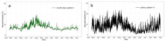The dew point spread is defined as the difference between temperature and dew point temperature; it is an important physical quantity in microclimatic analysis as it gives information about saturation danger. If the dew point spread is close to 0 °C or lower, condensation can occur; otherwise, its value gives information about the distance from the saturation condition. In the presbytery, the air condition is always far from condensation (Figure 11a), whereas under the portico (Figure 11b), dew point spread is lower but it is always positive.
