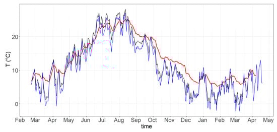 Daily temperature inside the church (red), outside below the external portico (black) and at the S. Vito meteorological station (blue).