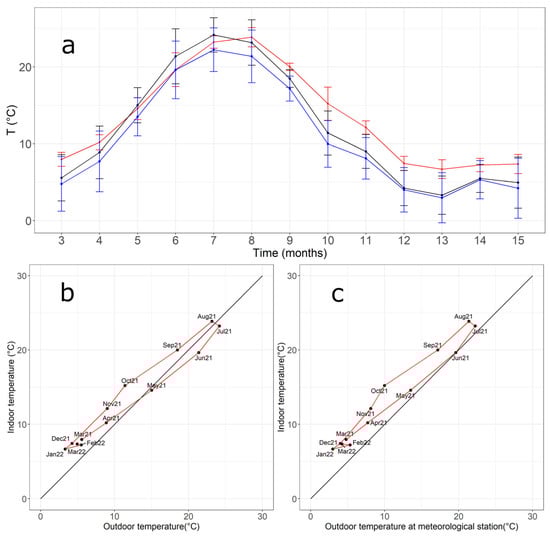 (a) Temperature monthly averages inside the church (red), below the external portico (black) and at the S. Vito meteorological station (blue); (b) scatter diagram with inside and outside (portico) monthly temperature; (c) scatter diagram between inside and outside (meteorological station) monthly temperature.