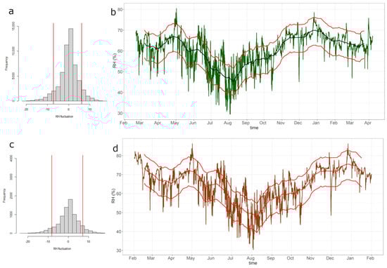 Historical relative humidity variability according to EN 15757 standard, in the figures red lines and curves show the 7th and 93rd percentiles; (a) distribution of relative humidity fluctuations at crucifix top site; (b) relative humidity variability at the crucifix top side (green line); (c) distribution of relative humidity fluctuations in the left side of the apse; (d) relative humidity variability at the left side of the apse (brown line).