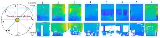 The RGB camera has a resolution of 2592 × 1944 pixels with an FoV of 60° × 45° (V × Hz). The thermal camera takes 10 images of 120 × 160 pixels with a reduced field of view of 71° × 56° (v × h), thus equally covering 360° × 71°. These ten images are subsequently used to assign temperatures to 3D points. It functions in a temperature range of between −10 °C and 65 °C, and its thermal sensitivity is 0.05 °C. Figure 1 shows the assignment of thermal images to 3D points for each IR image in Zone 0 (lab). The thermal image and the portion of the point cloud with the assigned temperature are displayed in pairs.