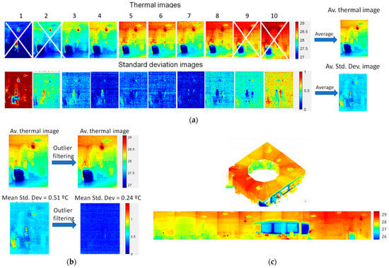 As explained in Section 3, the thermal camera variability issue is solved by repeating thermal images from the same viewpoint and then detecting and removing the outlier images. Figure 2a provides an example of this process. In this case, ten thermal images for the first rotation of the platform are analysed. The discrepancy between the temperatures can be clearly appreciated since it reaches up to 1.5 °C in repetitions 1 and 10. Below are the standard deviation images with respect to the original mean thermal image. In this example, the outlier detection algorithm concludes that images 1, 2, 9 and 10 are outlier images. The average image of repetitions 3, 4, 5, 6, 7 and 8 is, therefore, taken as the corrected and representative thermal image corresponding to the first rotation of the thermal camera. Figure 2b presents the average original and standard deviation images before and after carrying out the outlier image filtering process. As can be seen, the average standard deviation image now has a mean value of 0.24 °C, which is a considerable improvement to the earlier value of 0.51 °C. The average image will later be used to calculate a partial thermal cloud corresponding to the first rotation of the platform.