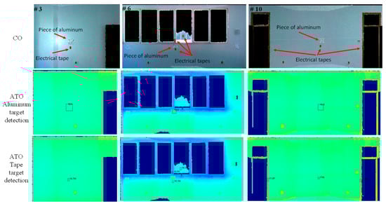 Upon processing COs and ATOs, as explained in the four steps shown in Section 4, the real thermal orthoimages are eventually obtained. Figure 3 illustrates the COs and TOs corresponding to SEs #3, #6, #9 and #10 of Zone 1 (Room East1), in which wrinkled pieces of aluminium foil and electrical tape have been placed on four faces of the room. All these targets are automatically recognised and delimited in the COs. The dual ATOs are then used to first calculate the reflected apparent temperature by means of Equation (1). The real temperatures of pieces of electrical tape near a door frame (if any), a window frame (if any) and wall areas are calculated according to Equation (2). Figure 4 shows how the aluminium foil and electrical tape targets are automatically detected. The emissivity of the objects “window frame”, “door frame” and “wall area” is obtained from Equation (3) using the mean temperature of narrow rings around the corresponding targets. Finally, the real temperatures of all the objects are calculated using Equation (4).