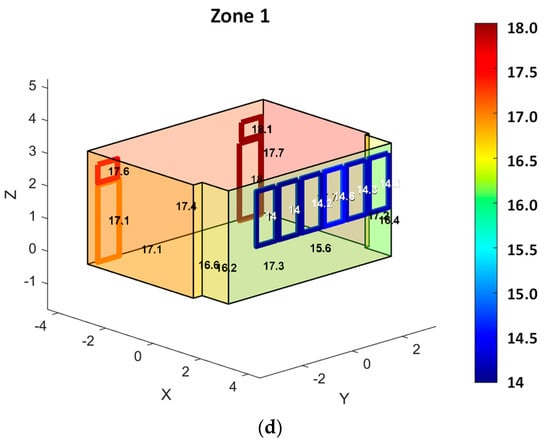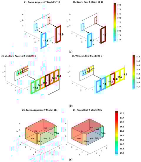 Finally, Figure 4 illustrates the correction of the temperature before and after performing the correction of temperature explained in Section 4. Figure 4a,b show the results for doors in SE #10 and windows in SE #6, whereas Figure 4c represents the thermal model that includes the faces corresponding to the floor, ceiling and walls. Figure 4d shows the final corrected model with all the objects and assigned temperatures.