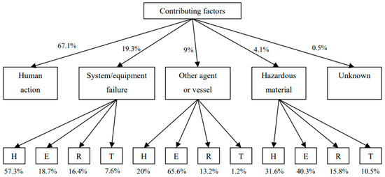 Tree of events of contributing factors to accidents. Source: own study based on [25]. H—Human behavior, E—Environment, R—Rules, procedures, and training, T—Tools and equipment.