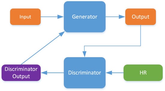By inputting a low-resolution picture, the generator network generates a false super-resolution image. The generator’s fake image output, along with the actual image, is fed into the discriminator network. After the discriminator comparison, the return information of true or untrue is output, and the return information is fed into the generator network, which optimizes the network weight based on the return value to produce a more realistic high-resolution picture. The entire network can be used to reconstruct the HD image in the continuous confrontation between the generator and the discriminator, until the image produced by the generator cannot be judged as true or false by the discriminator. The GAN objective function is shown in Equation (1):