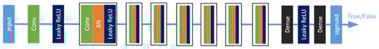 The IRB module adopts an inverted residual structure, which first performs projective convolution to raise the dimensions, then passes through depth-separable convolution, and finally uses projective convolution to reduce the dimensions, because a depth convolution kernel is performed on only one channel of the feature layer, so the computation is not too large, and each IRB network contains three convolutions, three BN layers, and two SiLU activation functions to fully combine the features. The residual module reduces a large number of parameters and the size of the space occupied by the model, while preventing overfitting. The overall structure of the improved discriminator in this paper is shown in Figure 8:
