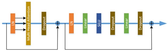 As shown in Figure 4, the VIT structure’s incoming information first passes through the Norm layer, which is normalized to CHW in the channel direction, and then is input to the Dropout layer after a multi-head self-attention mechanism, with the purpose of network regularization to prevent overfitting, and the output information is finally input to the MLP network after another Norm layer, and the multilayer perceptron can strengthen the adaptive, self-learning capability of the model. In a complete VIT process, the multi-headed self-attentive mechanism is a very important step. The multi-headed self-attentive mechanism is a stack of single-headed self-attentive mechanisms, which can extract different information from the feature map and find parameters in multiple parameter spaces, which makes the reconfiguration of the network more accurate. The expression for the self-attentive mechanism is shown in Equation (2):
