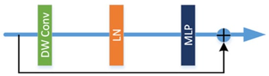 As shown in Figure 5, the module uses a larger convolutional kernel because the variability of adjacent pixel points of PCB images is not very large, and the size of the convolutional kernel is increased so that the model can better extract the high-frequency information of the feature map in the shallow features, while DW convolution is used to reduce the number of model parameters, the introduction of the layer Norm layer can better suppress the overfitting phenomenon of the model, and the residual structure can prevent the network gradient explosion and enhance the gradient propagation, thus improving the model learning ability.