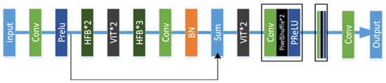 Three phases of development have occurred for super-resolution image reconstruction algorithms [5,6]. Early methods primarily included interpolation-based algorithms [7] and algorithms built on reconstruction [8], which work in the pixel and frequency domain dimensions, respectively, but the final image reconstruction results are not ideal because both methods are limited by the image itself. With the brisk growth in the field of deep learning in recent years, an increasing number of scholars have devoted themselves to introducing deep learning techniques into the field of image resolution. In 2014, Dong proposed the SRCNN algorithm [9]; this was the first time deep learning techniques had been used in image reconstruction. It intended to build an end-to-end network model that nonlinearly maps pictures using a three-layer convolutional neural network. When compared to previous algorithms, the final high-resolution images generated by this algorithm are considerably improved in every way, but they still suffer from slower speed and higher computational cost. Dong suggested the FSRCNN algorithm in the same year to address these issues [10], which optimized the SRCNN network structure to reduce training costs and speed up operations while maintaining good performance. Tai introduced the DRRN [11] deep recursive residual network-based image reconstruction algorithm in 2017, which reduced network parameters and optimized network performance. In 2022, Lu proposed a new Efficient Super-Resolution Transformer (ESRT) for SISR. ESRT is a hybrid model that consists of a lightweight CNN backbone (LCB) and a lightweight deformer backbone (LTB) [12]. In 2023, Ariav proposed a fully transformer-based depth map super-resolution network. The method incorporates a novel cross-attention mechanism that seamlessly and continuously guides color images into a depth upsampling process [13]. Following that, different deep learning network structures were applied to the field of super-resolution image reconstruction [14] with remarkable results.