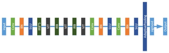 As can be seen from Figure 8, the input information of the discriminator first goes through a shallow feature extraction by convolution, and then enters the backbone network composed of IRB module and VIT module after BN layer and SiLU activation function. The DWPW convolutional inverse residual block in the backbone network can quickly extract and summarize the shallow features compared with the traditional convolution, and the VIT added later can give the high-level features for global feature synthesis, which facilitates the effect of discriminators and reduces the spatial complexity by making full use of the features. The backbone network is followed by the pooling layer and the fully connected layer, and the final output completes the discrimination of HD images or reconstructed images.