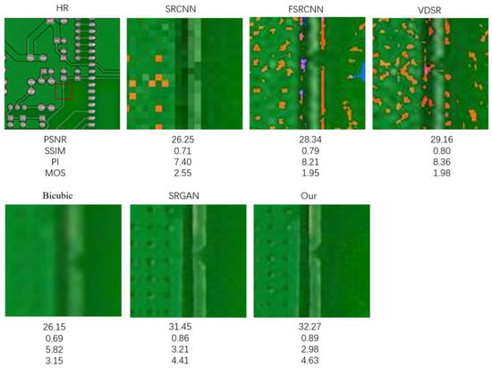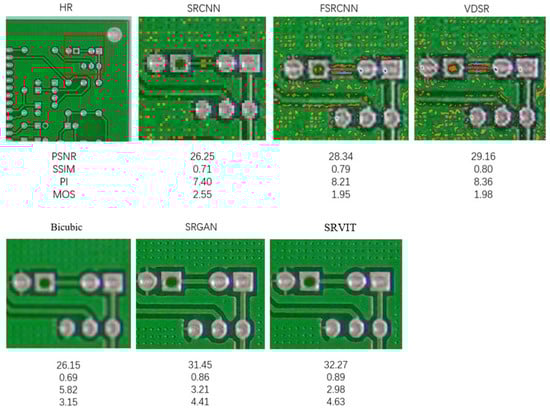 According to Table 2, the quantitative evaluation results and the displayed images in Figure 9, the image reconstructed by the Bicubic method is poor, with the lowest values of PSNR and SSIM, the overall visual effect is blurred, and the MOS score is low. The three algorithms SRCNN, FRSCNN, and VDSR have improved values in the objective evaluation metrics compared to Bicubic. The general outline of the image is clearer than Bicubic, based on the CNN’s expertise in capturing low-frequency information. However, because they are not good at capturing high-frequency information, the image details are severely lost and distortion occurs, and the MOS scores are all very low. Both SRGAN and SRVIT algorithms showed significant improvements in image reconstruction quality. Looking closely at the defective solder in Figure 9, the reconstructed image of the improved model is sharper at the edge of the inner hole and the SRGAN reconstructed image shows a slight distortion at the copper deposit below the solder hole; the reconstructed image of the improved model shows no distortion at the copper deposit. In addition, in Figure 10, the reconstructed image of the improved model is sharper at the inner wire edge at the defective notch. SRVIT optimizes and improves on the shortcomings of SRGAN, such as inadequate local feature extraction and distortion. The improvements were achieved in both objective PSNR and SSIM values, where PSNR improved by 0.82 dB and SSIM improved by 0.03, and in subjective MOS scores. The comparison of the spatial complexity of SRVIT and SRGAN is shown in Table 3: