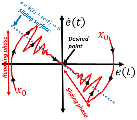where represents the equivalent controller, is a sign function that creates a discontinuous control input resulting from a limited switching around the sliding surface and is a constant. The trajectory of the controlled system moves along the manifold during the application of SMC as a result of the actions of several structures and follows the switch condition known as the chattering phenomenon displayed in Figure 3. It has been suggested that switching functions [36], denoted by x, that may be a scalar or a vector, define the system structure during SMC. In the phase plane, the switching surface can be seen as a line with the symbol .