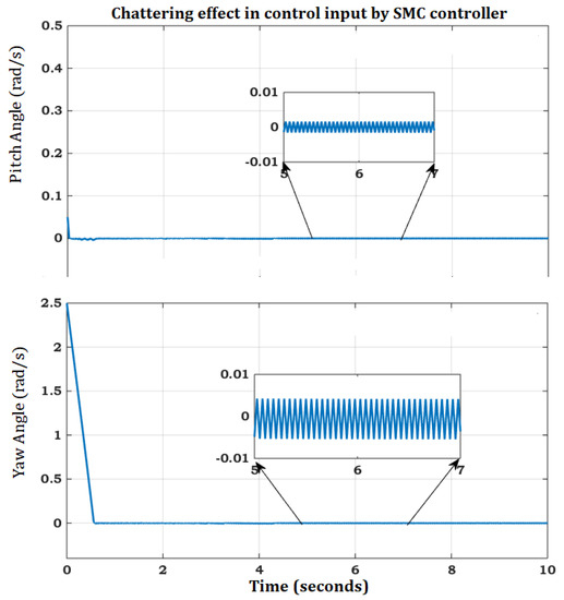 A strategy that is frequently used to evaluate the stability of nonlinear systems based on ODE theory is the use of a Lyapunov function. The Lyapunov function should be determined in order to verify the system’s stability according to ODE class theory, it must be negative definite. This requirement is adequate to ensure the nonlinear system’s asymptotic stability. However, creating a suitable Lyapunov function for ODEs can be challenging. It has been noted that the sliding motion in the context of sliding mode control (SMC) happens close to the sliding surface, much like the frequency switching phenomenon. In SMC, the system’s nonlinear behavior may attempt to move away from the sliding surface, but the controller will compel the system to follow the line until it reaches the origin, referred to as the boundary layer. SMC simulations have demonstrated satisfactory convergence for pitch and yaw angles. However, the SMC chattering pattern for these systems is unsuitable as it can pose a risk to the actuators. Figure 4 shows the rapid and sudden changes in voltage patterns that require highly optimized power suppliers. The TRMS output requires smooth convergence with a regular voltage pattern that can be optimized using an optimization method.