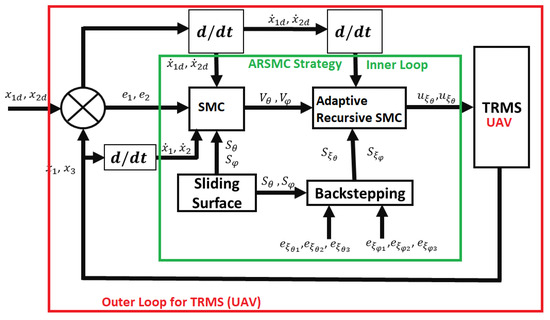 ARSMC is an advanced control strategy that combines adaptive control, recursive control, and sliding mode control (SMC) techniques to improve the control performance of complex nonlinear systems. In ARSMC, the system model is not required to be known exactly and the controller adapts to the changes in the system dynamics to achieve better control performance. The controller is designed recursively, which means that the current state of the system is used to update the controller parameters for the next control action. This allows the controller to track the changes in the system dynamics and adapt to them in real-time. The sliding mode control technique is used to force the system states to converge to a sliding surface that is defined based on the system model and the desired control objectives. The sliding mode provides robustness to the system against disturbances and uncertainties. The adaptive control technique is used to adjust the controller parameters in real time based on estimation of the system states and model parameters. Overall, the ARSMC strategy, represented in Figure 5, provides better control performance, robustness, and adaptability to complex nonlinear systems compared to traditional control strategies. It has been applied in various fields, such as robotics, aerospace, and industrial automation. This section implements an adaptive backstepping for position trajectory tracking control, taking the output vector for the UAV position as . The variables used in the design procedure for the MIMO system are: