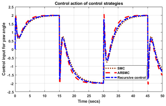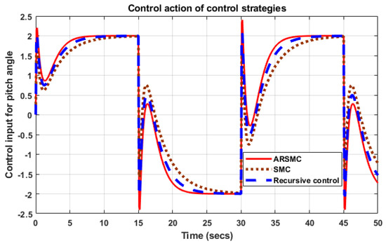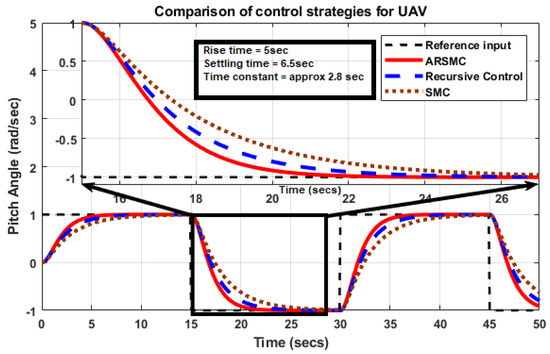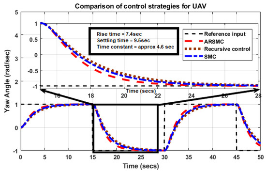The novel ARSMC strategy effectively addresses key issues, such as finite-time convergence, robustness for parametric perturbations, and singularity. To verify its effectiveness, we conducted a comparison study and evaluated the performance of the controller in terms of the vertical stability (pitch angle) and horizontal stability (yaw angle). Additionally, the controller was tested in the presence of disturbances, such as external disturbances, parametric uncertainties, coupling effects, and noise signals. The simulation response of TRMS under different control strategies provides key ideas on how the augmentation of a recursive strategy in SMC with adaptive laws performs better. The convergence time of pitch and yaw angles in Figure 7 and Figure 8 represents the brief response with their convergence time in subplots. The figure that shows the square input for both the pitch angle and yaw angle of the TRMS illustrates that the pitch angle has a faster convergence time than the yaw angle. This delay is because the main rotor must be stabilized first in order to counteract the disturbance generated by the tail rotor, such as the gyroscopic torque effect and the coupling effect. As a result, the convergence time of the tail rotor cannot be faster than that of the main rotor.