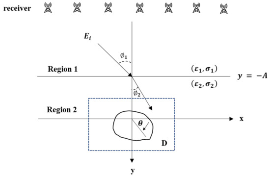 Consider a perfect conductor buried in a lossy half-space, as shown in Figure 1. The permittivity and conductivity in Region I and Region II are and , respectively. In each region, the permeability of free space is set to ; that is, only non-magnetic substances are considered. Let the scatterer be a cylindrical conductor extending infinitely in the z-axis. Its cross-sectional area in the -plane can be expressed by the equation . The time-varying relation of the incident wave is set to and its incident angle is , as depicted in Figure 1.