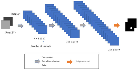 We employed the measured scattered fields as the input data and put it into the DCNN module for training. The × × 2 matrix comprises the input data transformed from the scattered fields using . represents the number of incident fields, represents the number of receivers, and the real and imaginary parts of will be split into two channels, as shown in Figure 2. Briefly speaking, comparing with the past conventional methods, using as the input value for the DCNN can cope with the EMIS problem efficiently.