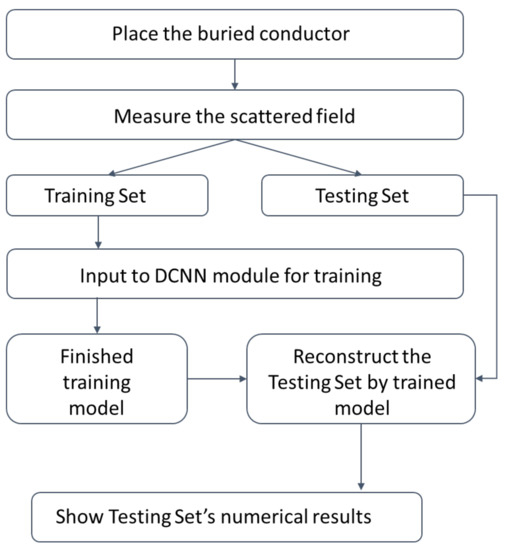 Figure 3 presents the flowchart of the complete experimental process. First, we place the conductors in a simulated environment. Then, the electromagnetic wave illuminates the buried conductors. Scattered field information with training and test data is inputted into DCNN for training. Upon DCNN training, test data are put into the trained DCNN for image reconstruction.