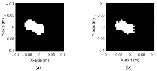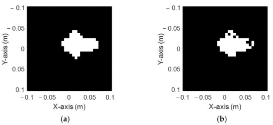 Figure 6a,b shows the ground truth arrow figure shape and the reconstructed shape by DCNN, respectively. It is seen that the reconstructed shape has some missing portions on the upper and right parts. In general, the reconstructed result is not perfect enough, though the size and position of the shape can still be recognized. The RMSE and SSIM are 17.81% and 80.01%, respectively, as listed in Table 1.