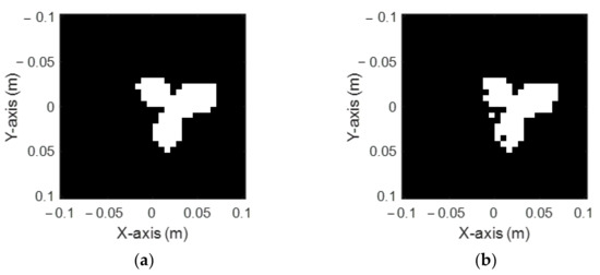 Figure 9a,b shows the ground truth three-petal shape and the reconstructed shape by DCNN, respectively. It is seen that the reconstructed shape has a little protrusion on the upper part, but the size and position of the shape can still be recognized. The RMSE and SSIM are 15.24% and 86.73%, respectively, as listed in Table 1.