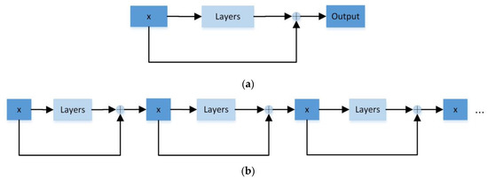 (a) Residual block structure. (b) Repeated residual block structure.